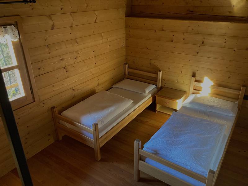 Ancora due scalini e si arriva in un secondo soppalco. È qui che troverete un bellissimo letto matrimoniale ricavato dalle travi del tetto, con oltre 170 anni di storia. Un tempo tagliati e lavorati a mano, ora, grazie alle mani sapienti di artigiani locali, questi legni culleranno il vostro sonno donando una bellissima sensazione di benessere. Di fianco, separata, un’altra stanza in legno con due letti singoli. Il bagno, invece, è dotato di doccia calda, asciugacapelli e tutti i servizi necessari.
